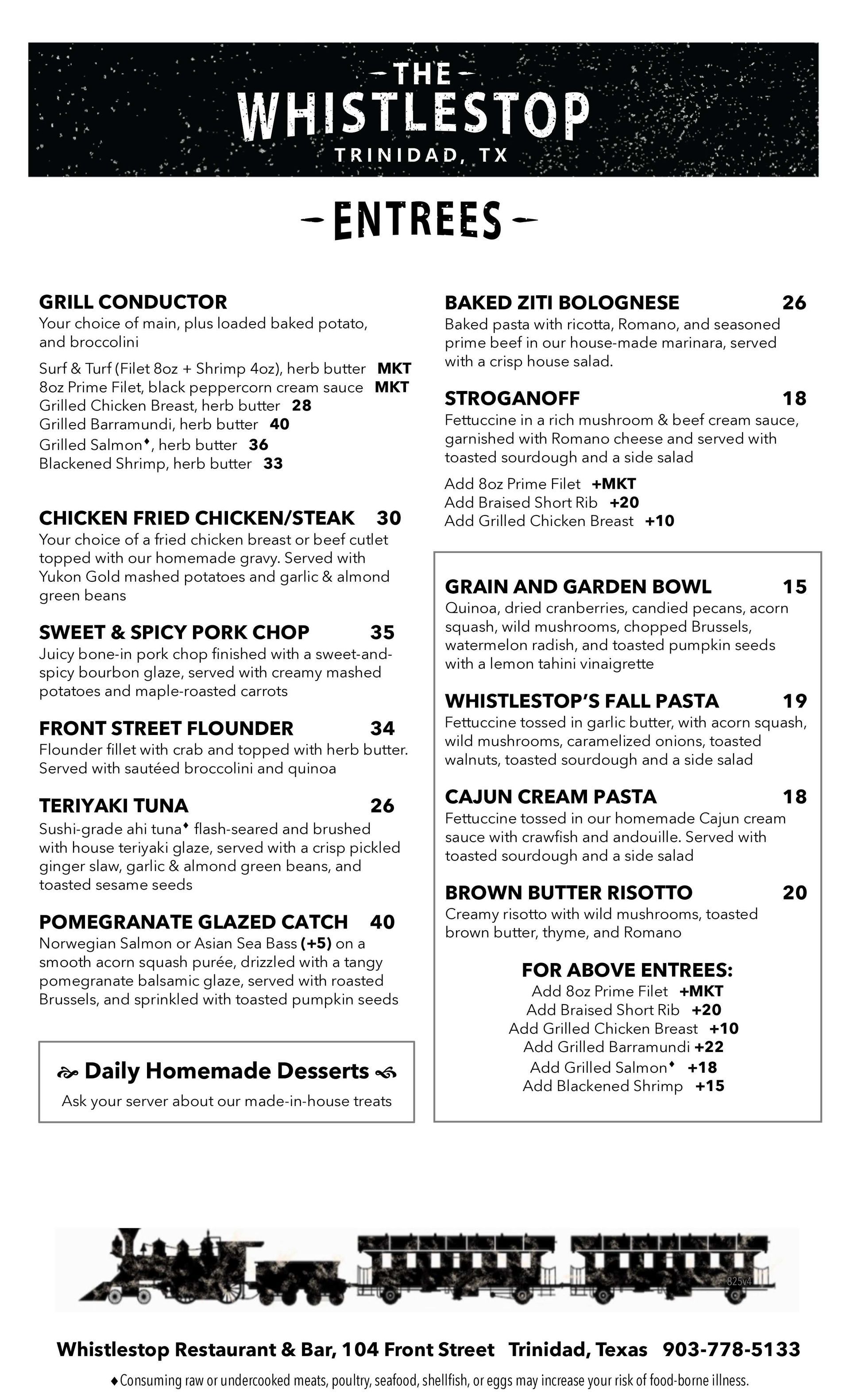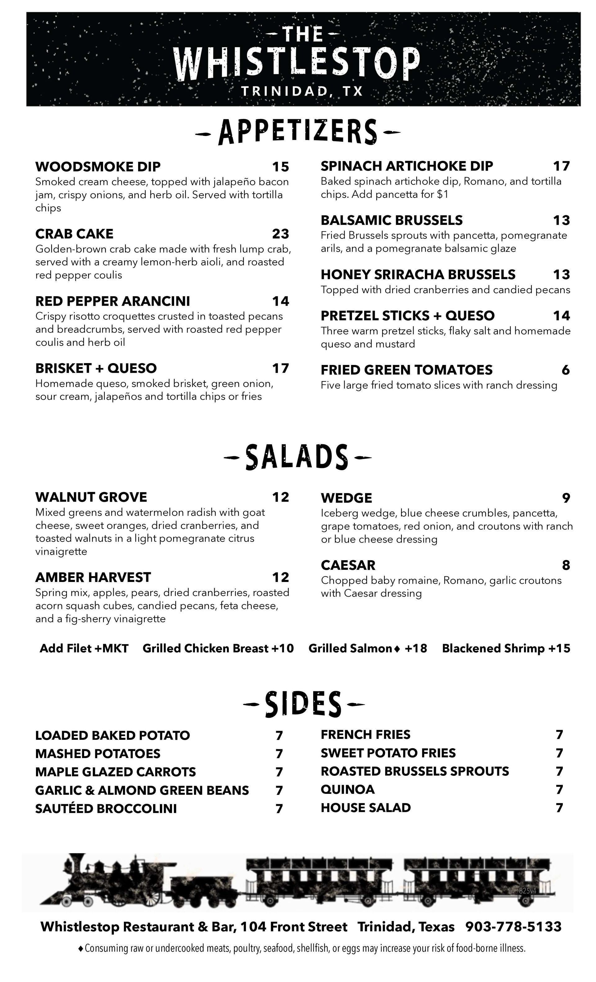 The Whistlestop, is an upscale American restaurant and bar nestled in Trinidad, Texas. Experience our one-of-a-kind menu in a charming rustic-chic setting, conveniently located near Cedar Creek Lake. From hosting special events to offering a variety of monthly happenings like live music and themed menu nights, we cater to everyone's taste! Bring your family, friends, or plan your perfect date night at The Whistlestop—the ultimate culinary destination at Cedar Creek Lake.